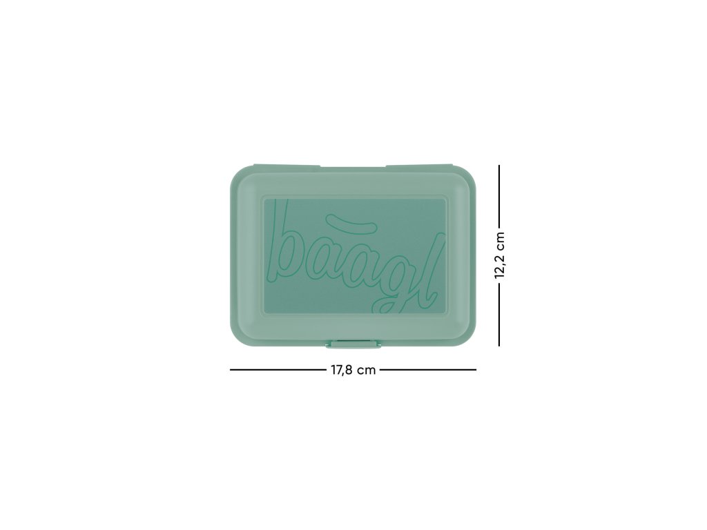 Světle zelený box na svačinu s logem BAAGL. Zahrnuje polohovatelnou přepážku pro oddělení potravin.