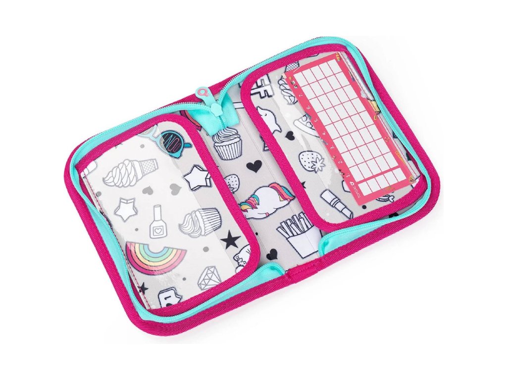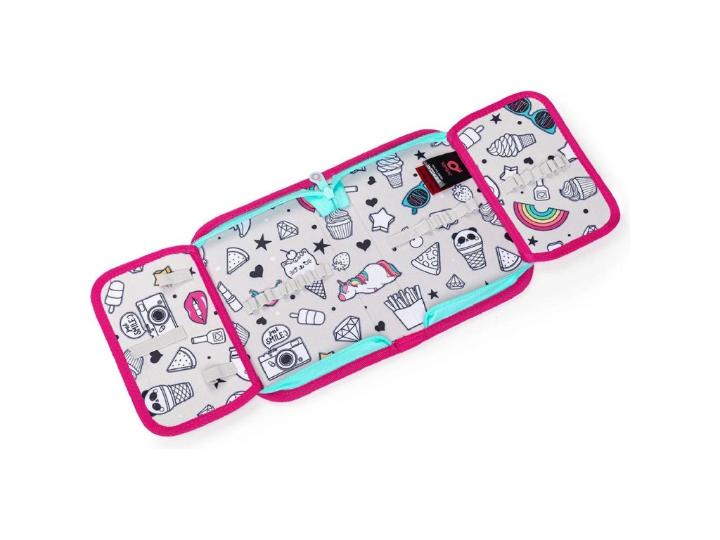 Jednopatrové školní pouzdro se dvěma klopami. Díky gumovým úchytům se do nich vejde celkem dvacetjedna pastelek, tužek a fixek. Tři širší úchyty poslouží na pravítko, kružítko či nůžky. Dva větší na gumu a ořezávátko.