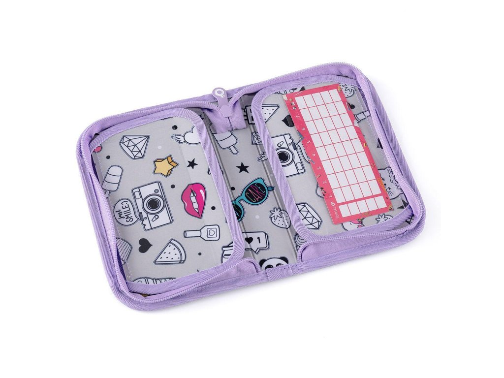Jednopatrový školní penál se dvěma klopami. Díky gumovým úchytům se do nich vejde celkem dvacetjedna pastelek, tužek a fixek. Tři širší úchyty poslouží na pravítko, kružítko či nůžky. Dva větší na gumu a ořezávátko.