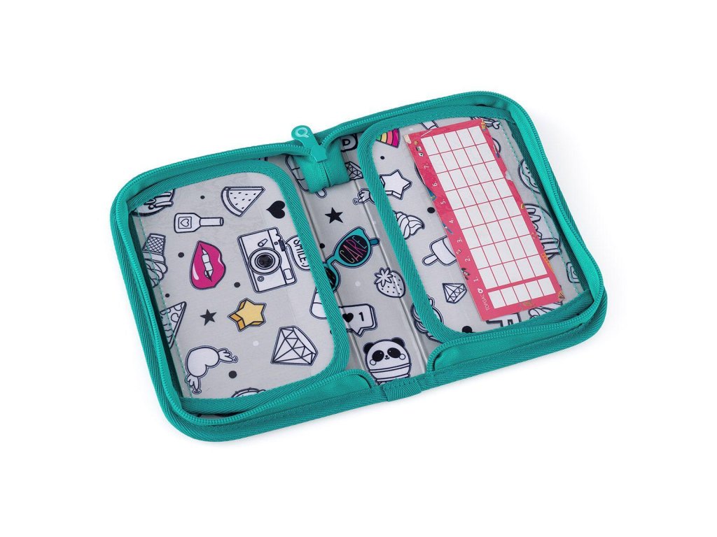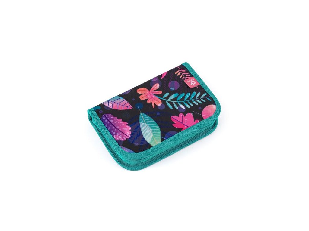 Jednopatrový školní penál se dvěma klopami. Díky gumovým úchytům se do nich vejde celkem dvacetjedna pastelek, tužek a fixek. Tři širší úchyty poslouží na pravítko, kružítko či nůžky. Dva větší na gumu a ořezávátko.