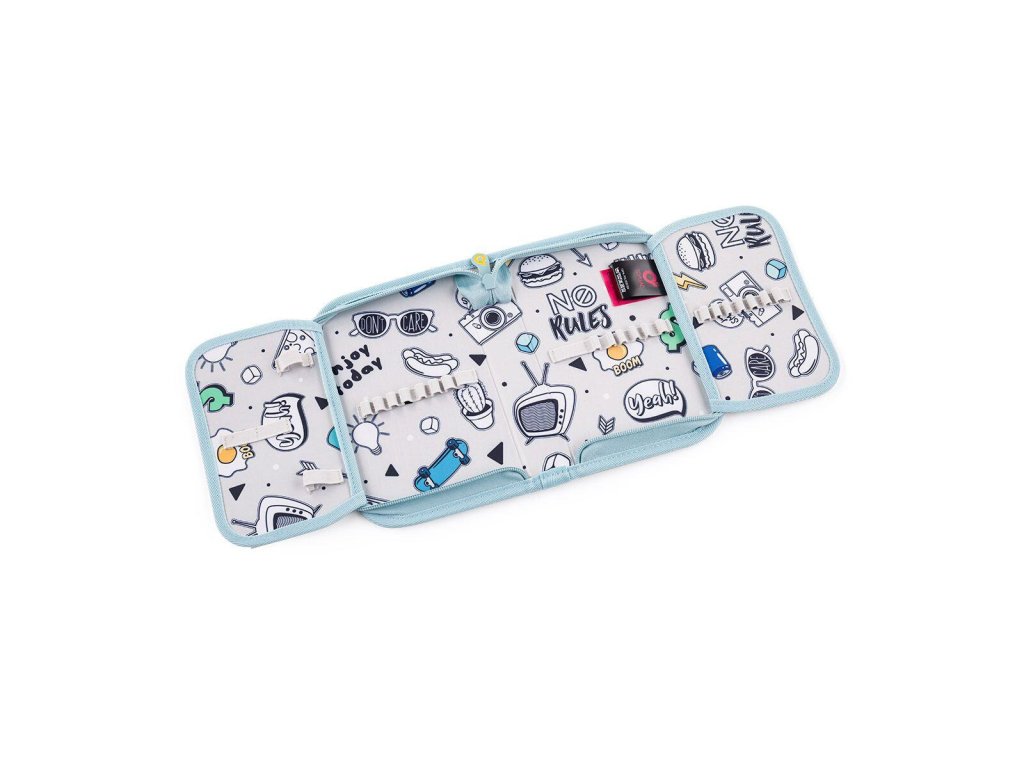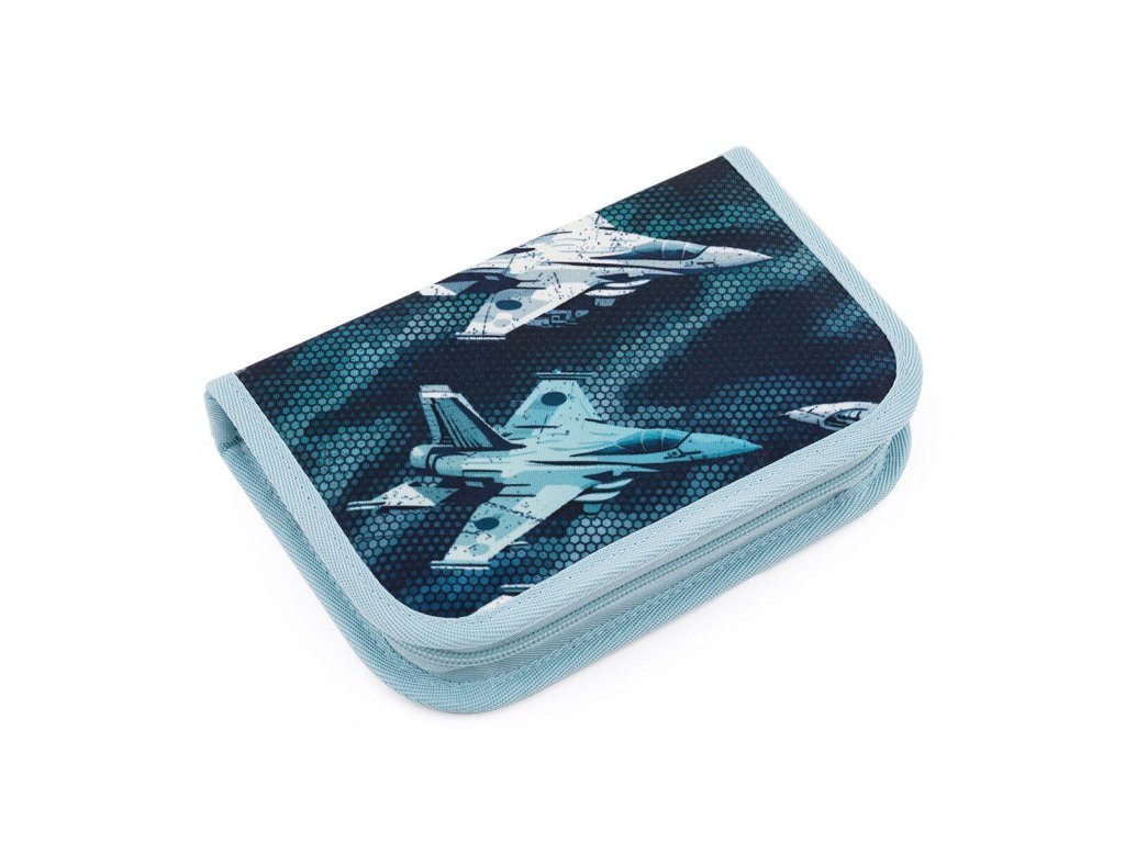 Jednopatrový školní penál se dvěma klopami. Díky gumovým úchytům se do nich vejde celkem dvacetjedna pastelek, tužek a fixek. Tři širší úchyty poslouží na pravítko, kružítko či nůžky. Dva větší na gumu a ořezávátko.