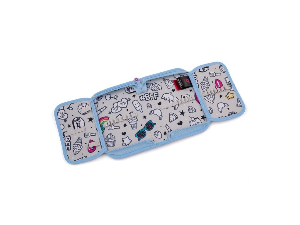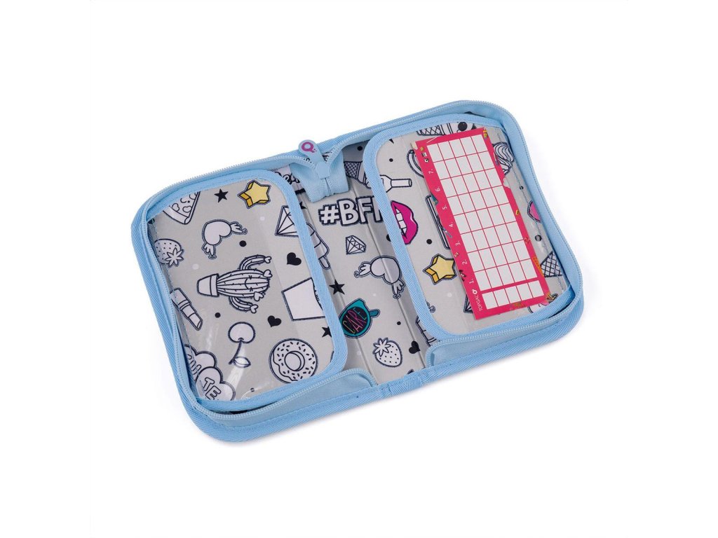 Jednopatrové školní pouzdro se dvěma klopami. Díky gumovým úchytům se do nich vejde celkem dvacetjedna pastelek, tužek a fixek. Tři širší úchyty poslouží na pravítko, kružítko či nůžky. Dva větší na gumu a ořezávátko.