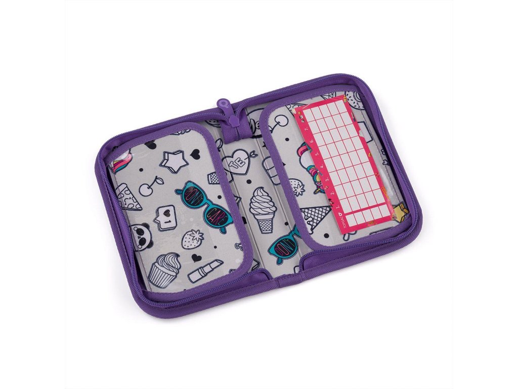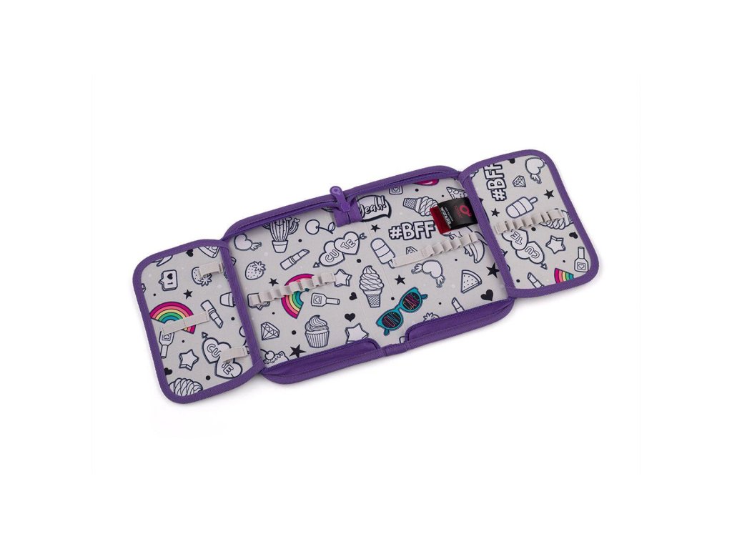 Jednopatrový školní penál se dvěma klopami. Díky gumovým úchytům se do nich vejde celkem dvacetjedna pastelek, tužek a fixek. Tři širší úchyty poslouží na pravítko, kružítko či nůžky. Dva větší na gumu a ořezávátko.