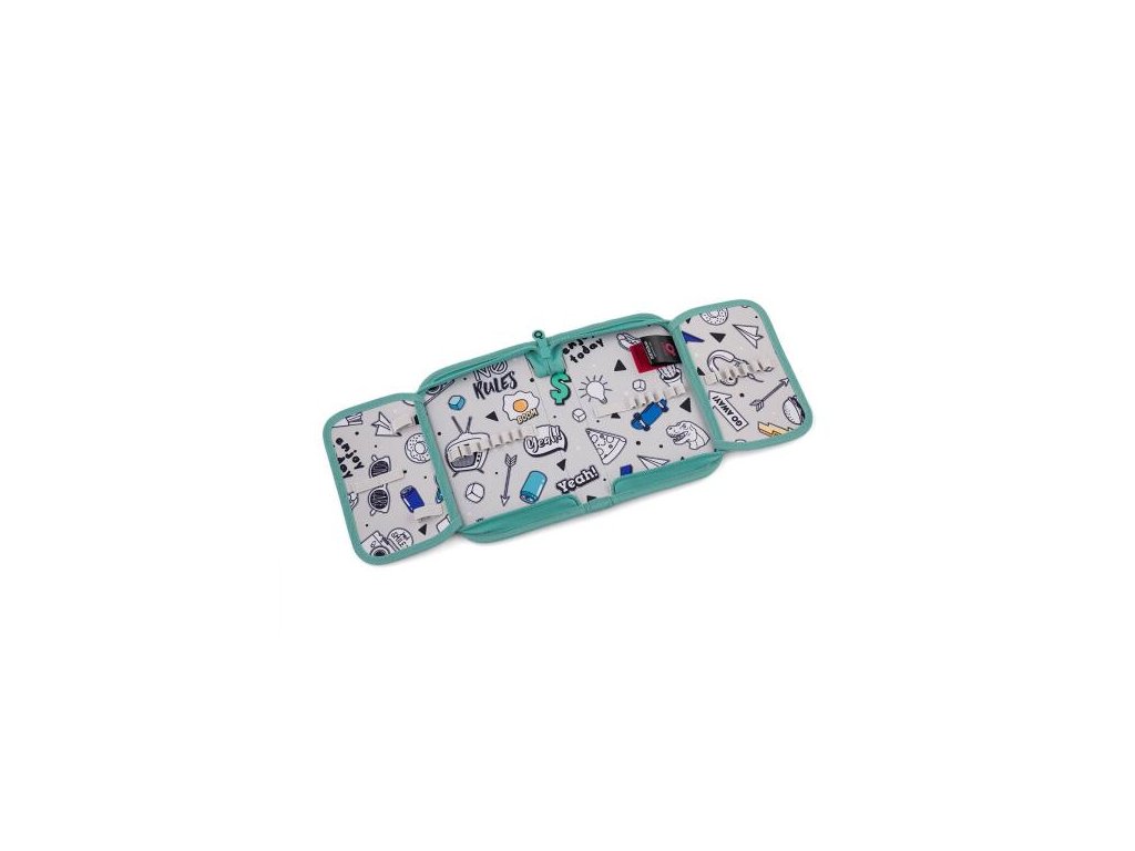 Jednopatrové školní pouzdro se dvěma klopami. Díky gumovým úchytům se do nich vejde celkem dvacetjedna pastelek, tužek a fixek. Tři širší úchyty poslouží na pravítko, kružítko či nůžky. Dva větší na gumu a ořezávátko.