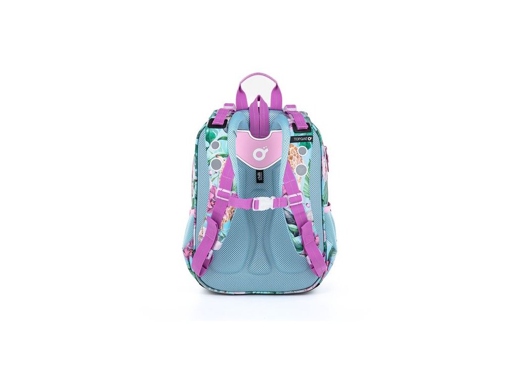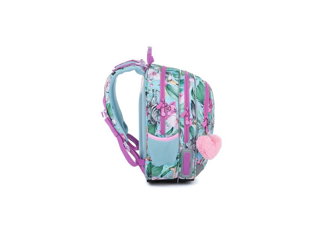 Tyrkysový batoh s růžovými zipy, se zvířátky ze safari a plyšovým srdcem jako přívěskem. Model ELLY neváží ani kilogram, proto je ideální pro holčičky od první až do čtvrté třídy ZŠ.