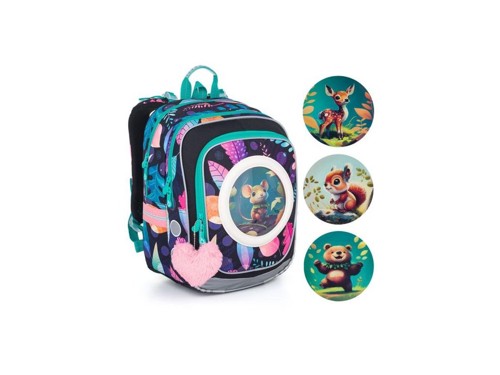 Model ENDY neváží ani kilogram, proto je ideální pro holčičky s výškou od 110 cm od první až třetí třídy ZŠ. Součástí batohu jsou čtyři obrázky s myškou, srnkou, medvědem a veverkou. Hravý design doplní plyšový přívěsek ve tvaru srdce.