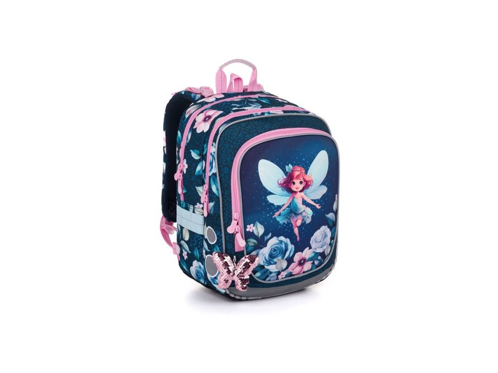 Dvoukomorový batoh ENDY s krásnou vílou a třpytivým přívěskem motýla. Batoh neváží ani kilogram. Je ideální pro malé víly s výškou od 110 cm do první, až třetí třídy ZŠ.