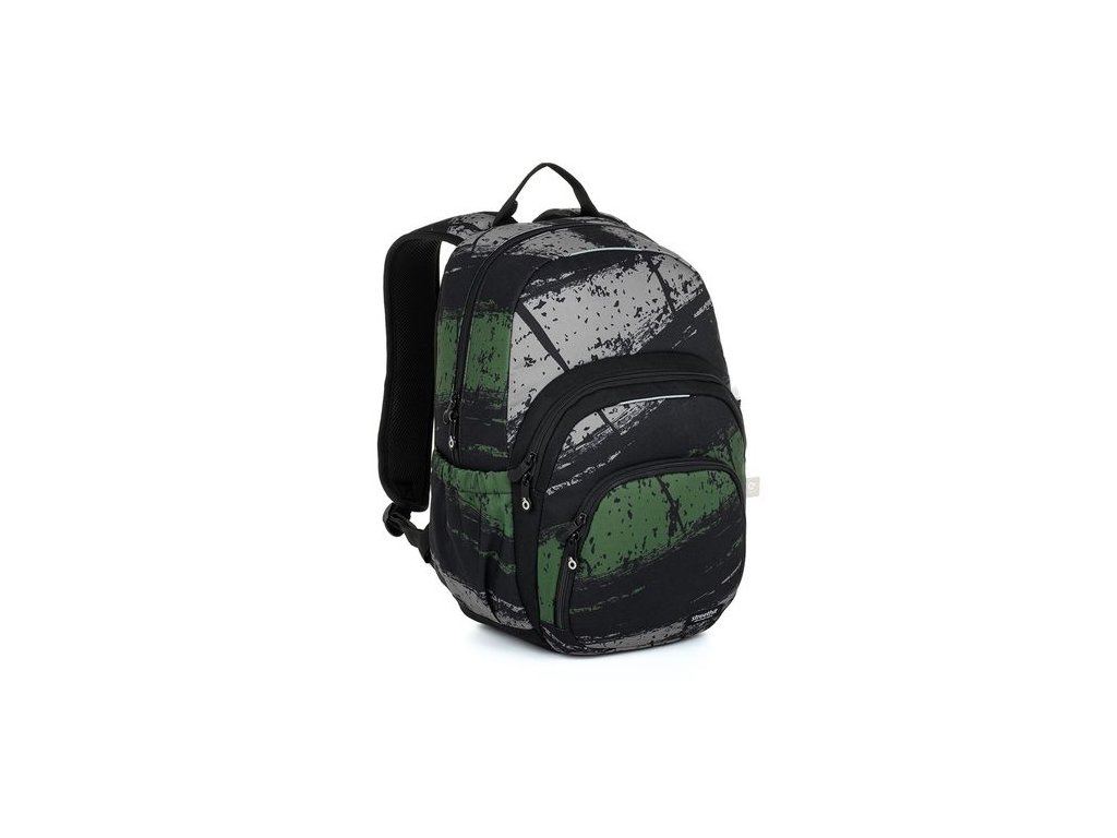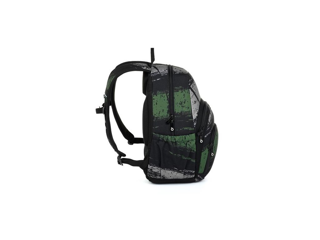 Jednokomorový batoh s zeleným a šedým žíháním doplní každodenní outfit dospívajícího kluka. Záda batohu jsou polstrovaná, anatomicky tvarovaná a pevná díky lehké hliníkové výztuze. Uvnitř zadní komory je umístěna polstrovaná kapsa na notebook i tablet.